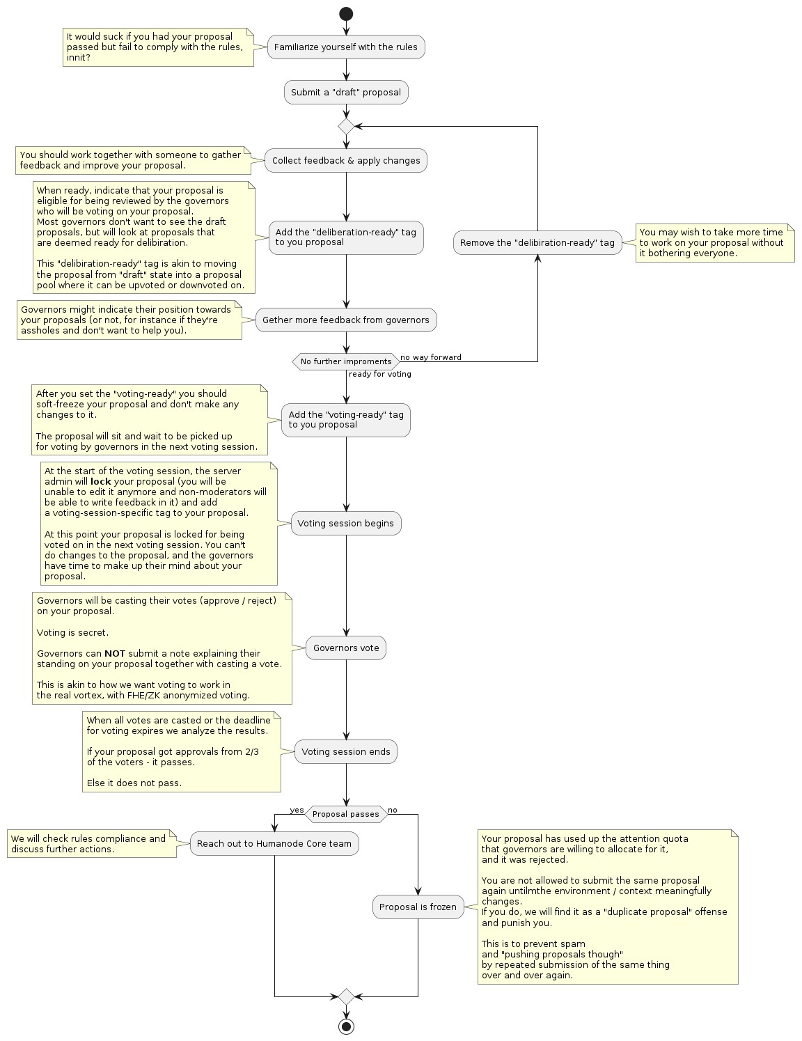 In simple terms, this means that each phase is quite important. You need to gauge the feeling during phase one. It might be important to work with someone during this phase in order to get meaningful feedback. The deliberation phase is also key. Governors who show interest in your proposal and ask questions are worth everything to you during this phase. Even if what they say seems harsh, or blunt, or even if they think your proposal is silly. You can use these voices as a sounding board and brush up on your proposal. No, you do not have to listen to everything they say, but even if a few governors do not agree with you, you may get a glimpse into what they hold value in, what types of proposals they are looking for, or how you can better explain why you feel your proposal will be important to the growth of Humanode.